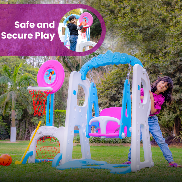 The OK PLAY 3-in-1 Swing & Basketball Set is the perfect playtime companion for active and growing kids. Designed to offer endless fun, this multifunctional set includes a secure swing with a safety belt, a basketball hoop to enhance hand-eye coordination, and a goal post to encourage football practice. Made from high-quality, non-toxic, and durable plastic, it ensures a safe and long-lasting experience. The sturdy base and anti-skid design provide extra stability, making it ideal for both indoor and outdoor use. With easy, tool-free assembly, parents can set it up effortlessly in a playroom, backyard, or garden. This playset not only keeps children entertained but also helps in developing their motor skills, balance, and coordination. Perfect for kids aged 2 years and above, the OK PLAY 3-in-1 Swing & Basketball Set is a wonderful way to combine fun with fitness while encouraging imaginative and social play.