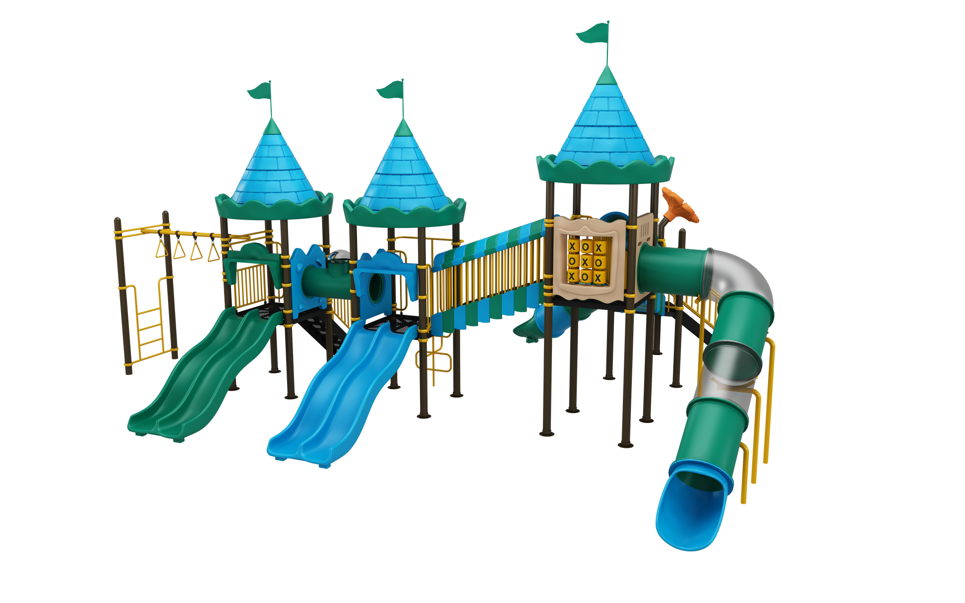 The Castle Series is offered across multiple product variants, each featuring a unique combination of play elements. Depending on the model, structures may include slides, climbers, crawl tunnels, interactive panels, bridges, guardrail platforms, and elevated play decks. The modular design approach allows flexibility in selecting the appropriate configuration based on play value, spatial planning, and age-group requirements, while maintaining a consistent castle-themed aesthetic.