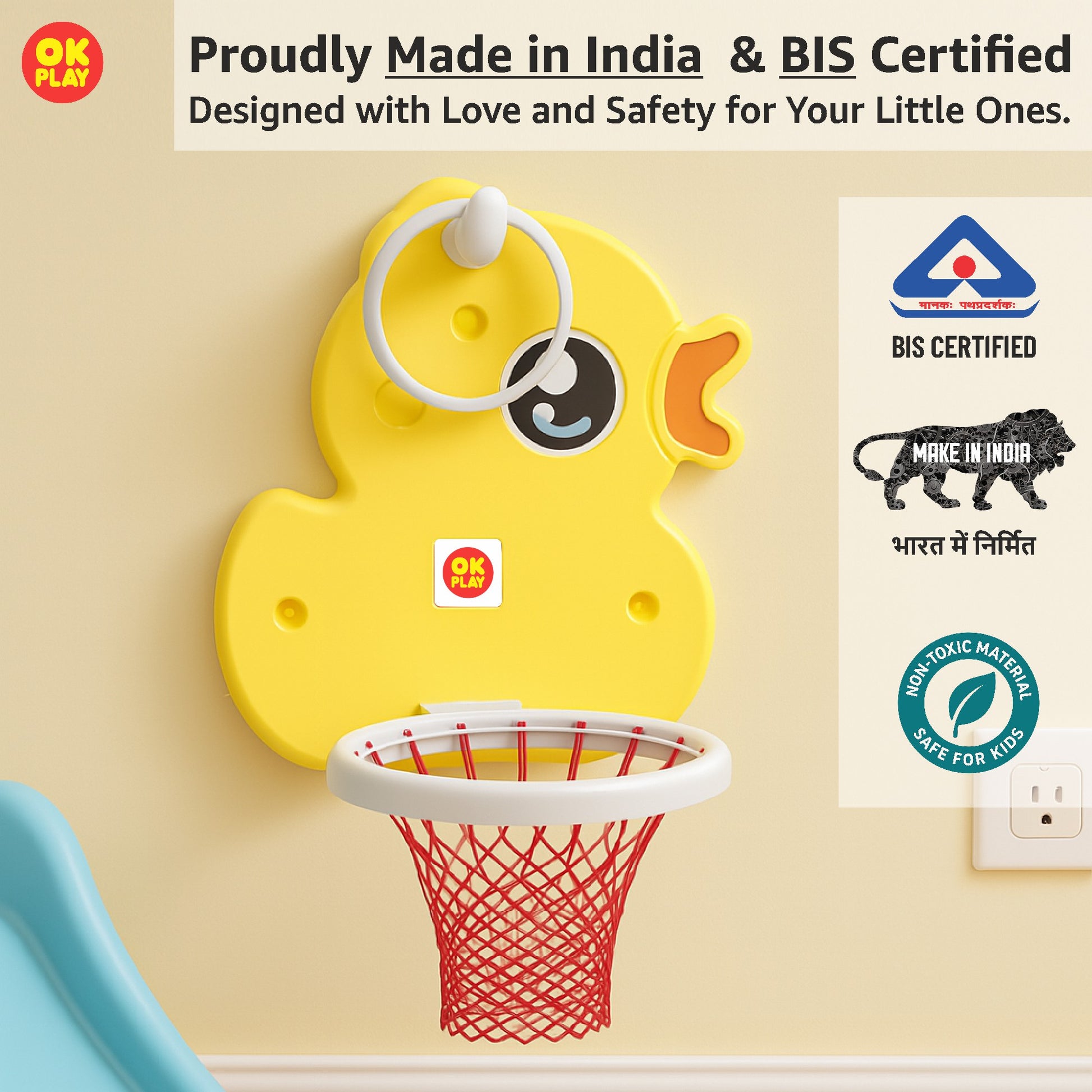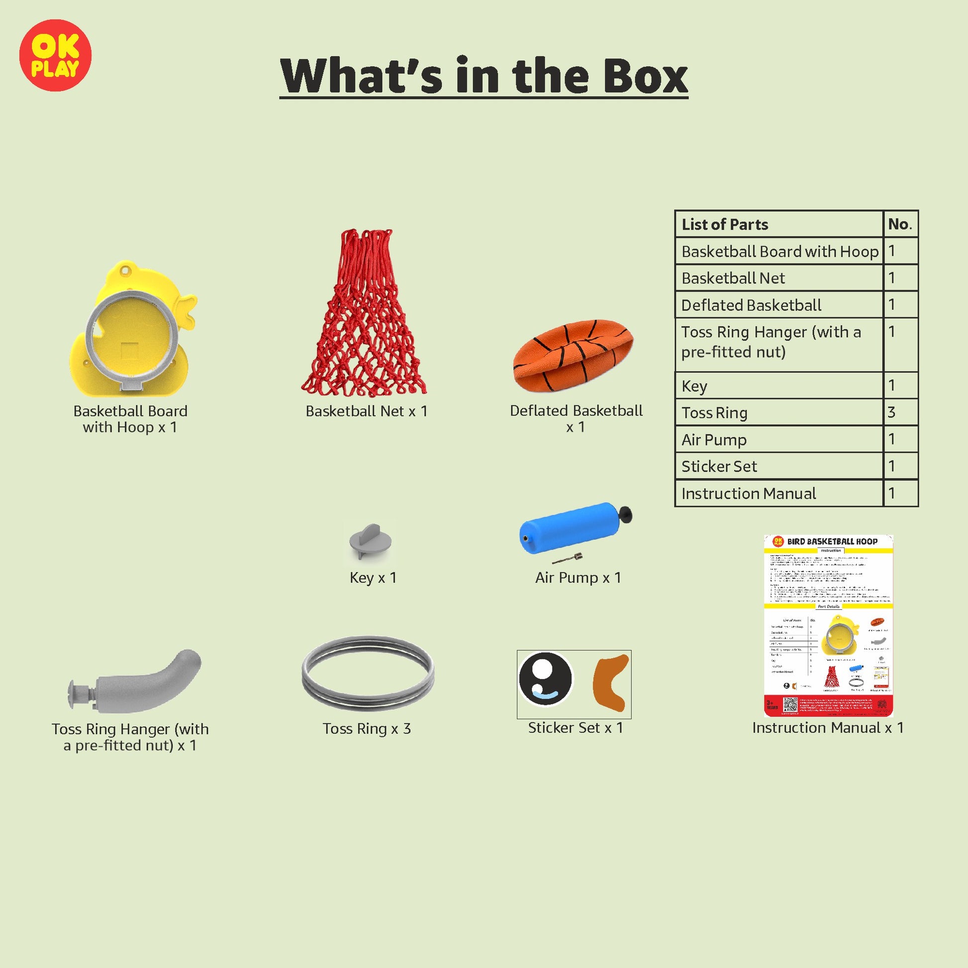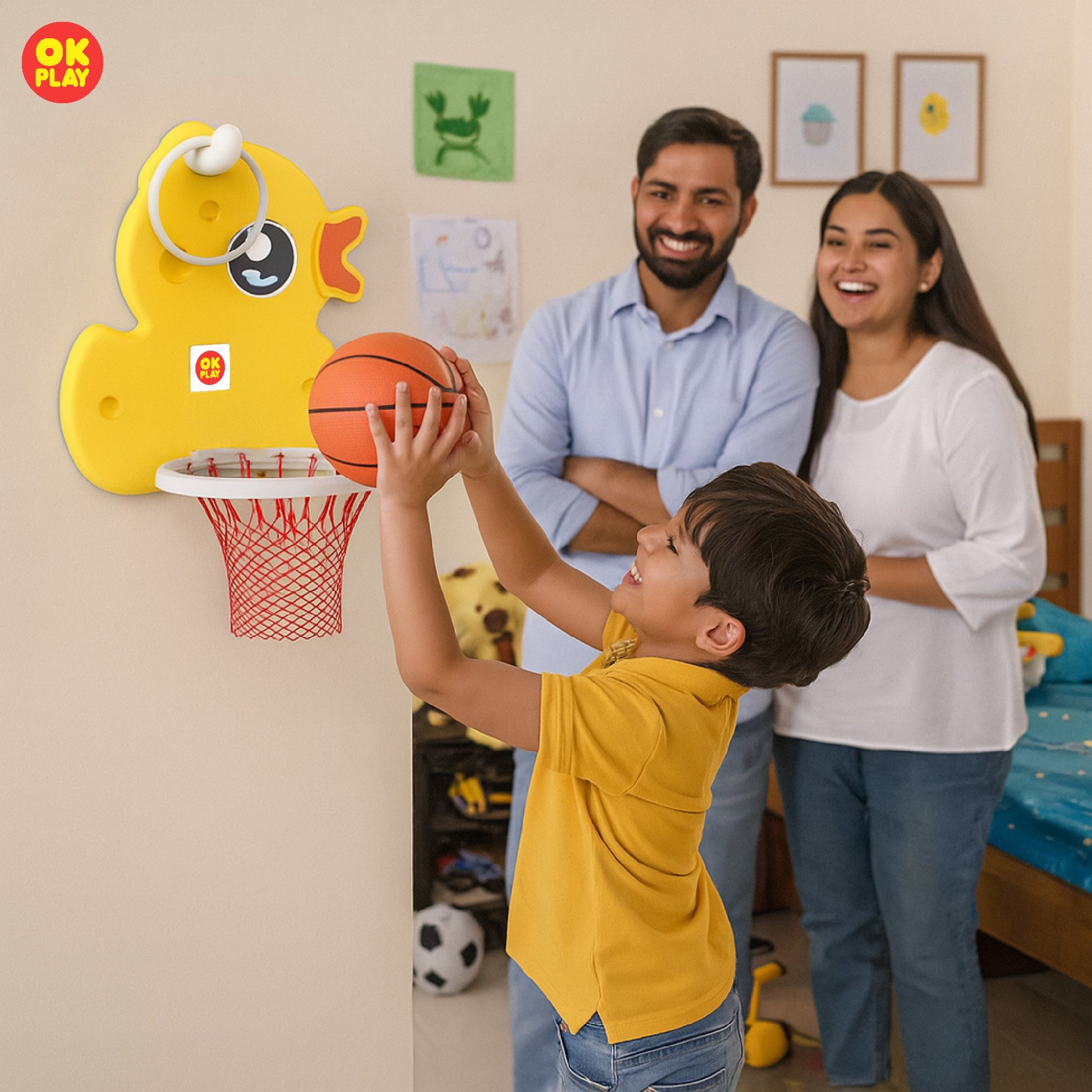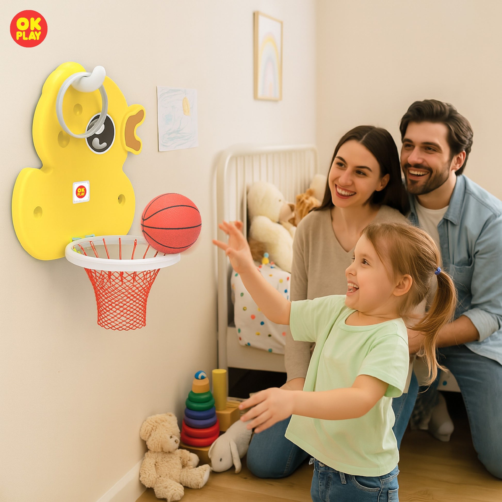 Introduce your little ones to the world of basketball with the OK PLAY Bird Basketball Hoop Set, designed to make playtime both exciting and active! Featuring a charming bird-shaped backboard with a matching hoop, this adorable sports set encourages hand-eye coordination, motor skills, and energetic fun.The easy-to-install wall-mounted hoop is perfect for indoor and outdoor use, making it an ideal addition to playrooms, backyards, or schools. The set includes a sturdy hoop, a durable net, and a lightweight basketball, ensuring safe and engaging gameplay for young kids.Crafted from premium, non-toxic plastic, this basketball set is built for long-lasting fun while ensuring child safety. Plus, with its easy installation process and included instruction manual, setting it up is hassle-free!Make sports fun and imaginative with this bird-themed basketball set—a perfect way to keep kids entertained and active.