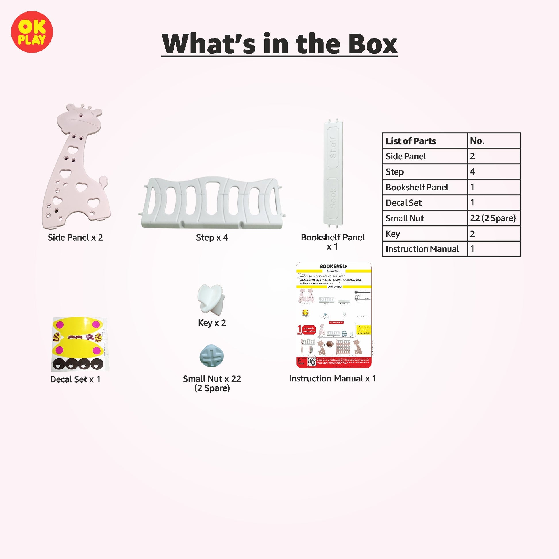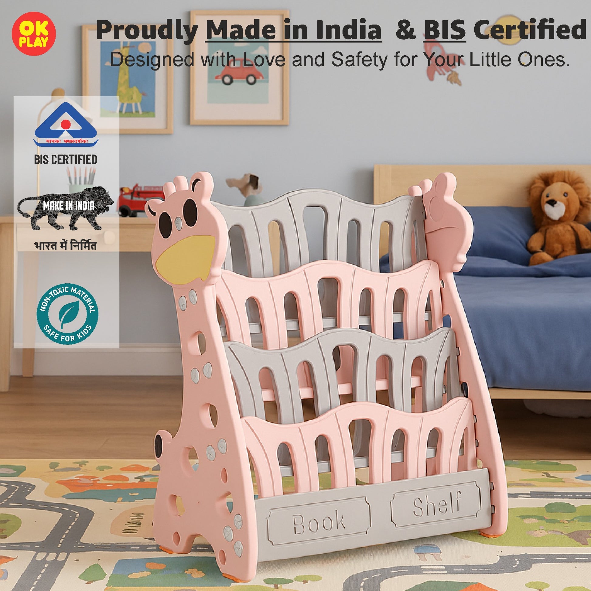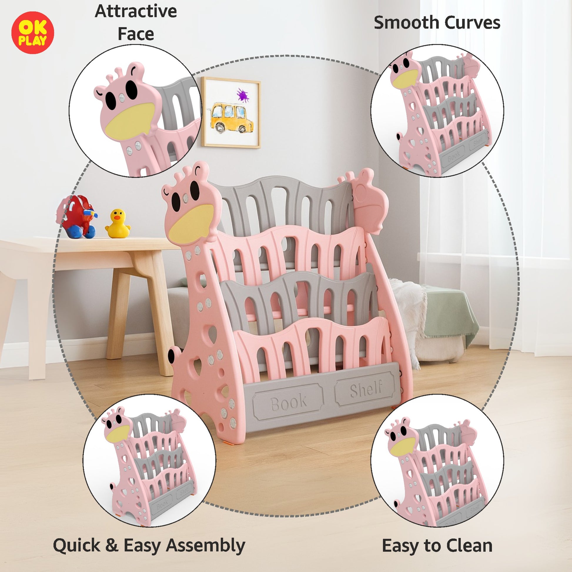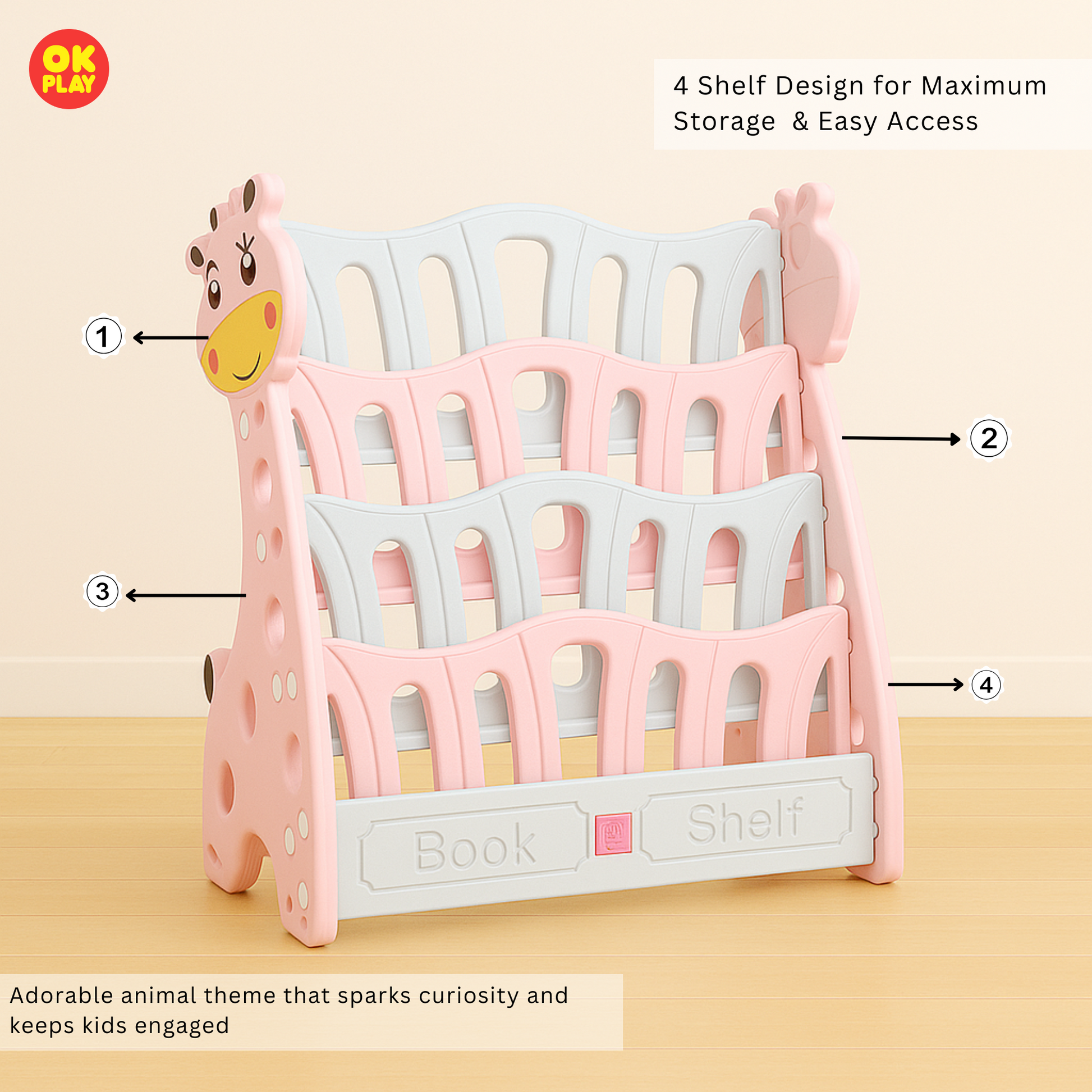 Ok Play Animal Theme Bookshelf for Kids | 4-Tier Display Rack | Storage | Organizing | Kids Bookcase | Easy Assembly | Compact | Portable | Perfect Gift | Medium