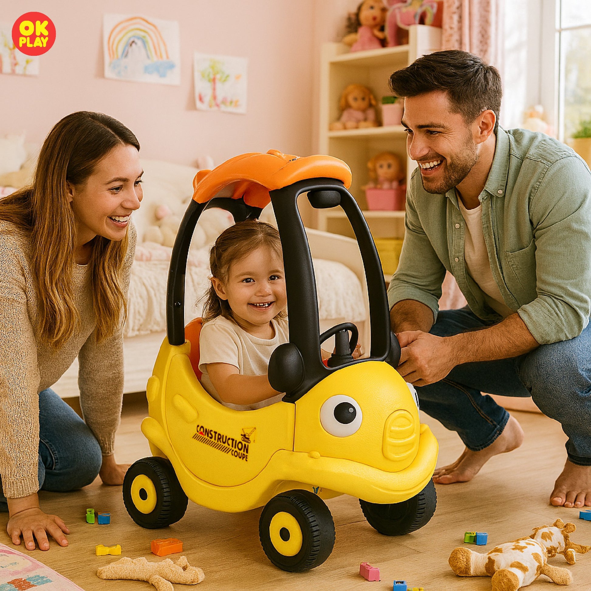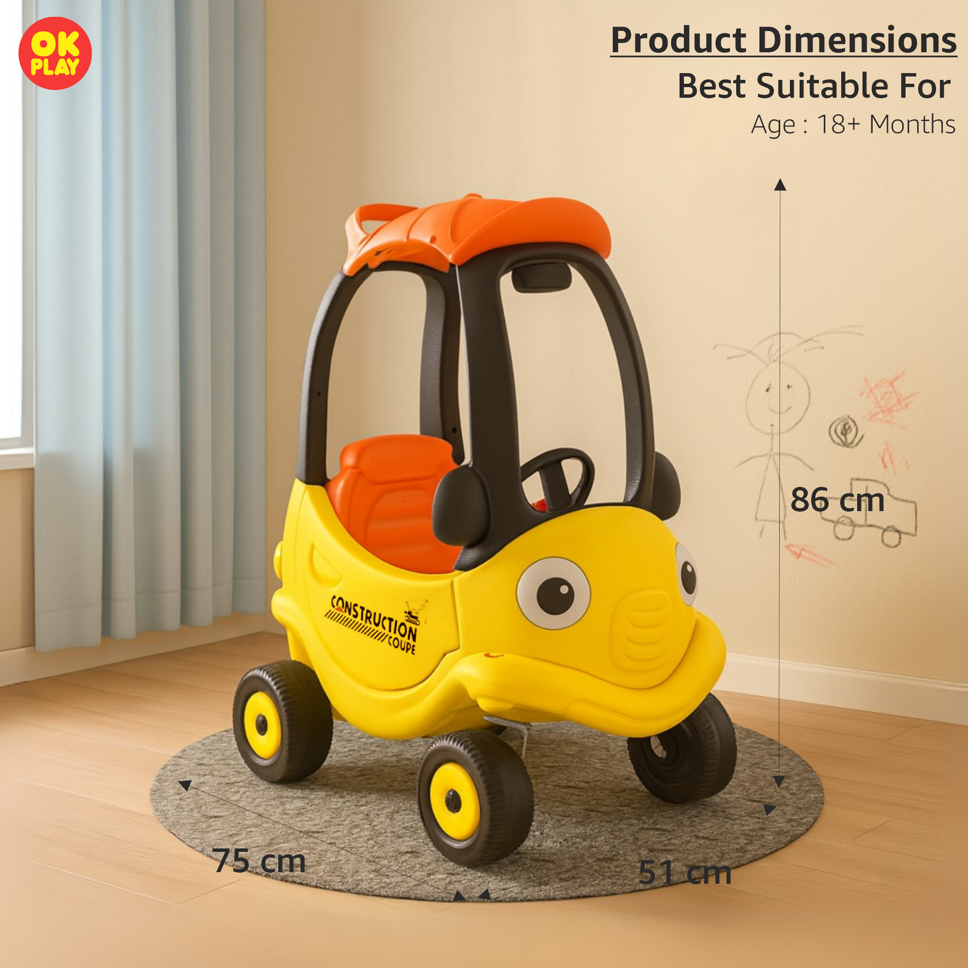 OK PLAY Construction Coupe Car | Ride On & Push On Car | with Steering Wheel | Doors on Both side | Round Edges | Indoor & Outdoor Play | Perfect for Home, School & Playground | Perfect Gift