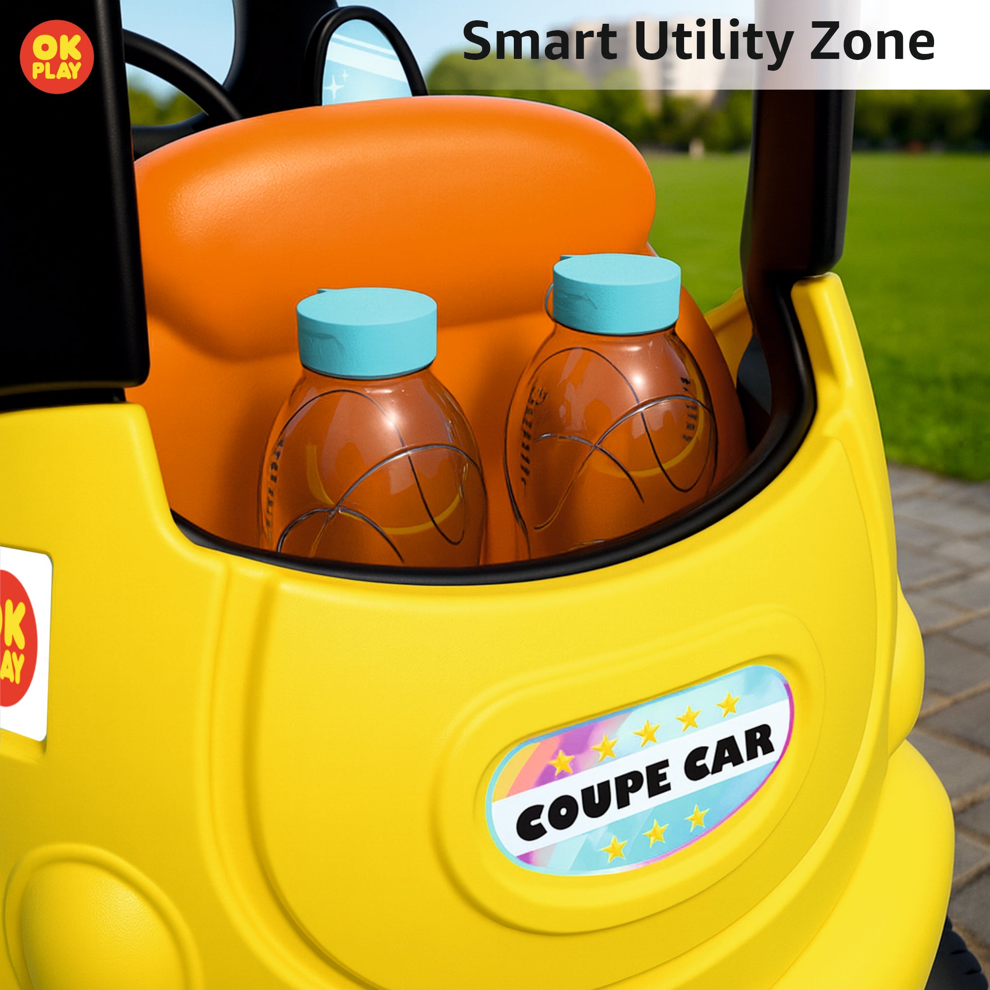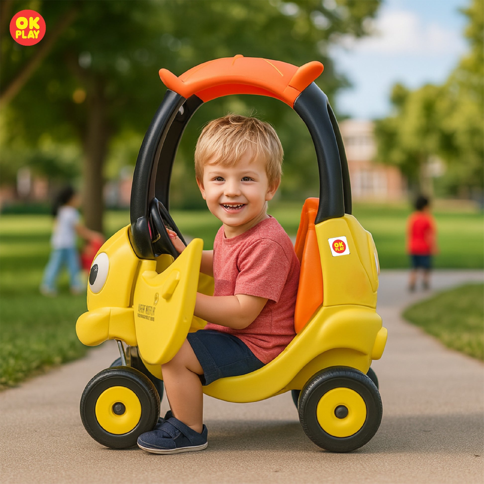 The OK PLAY Coupe Car is a fun and engaging ride-on designed for endless adventures. Made from durable, non-toxic plastic, it ensures a safe and sturdy experience for toddlers. Featuring smooth-rolling wheels, a 360° rotating steering wheel, and a horn, it offers an interactive and joyful ride. The spacious seat and back storage add extra convenience, allowing kids to carry their little essentials. It comes with a rear handle, enabling parents to push and guide their little ones with ease. Whether kids choose to push with their feet or enjoy a guided ride, it helps develop motor skills and coordination. Available in four vibrant colors – Blue, Yellow, Pink, and Orange, this coupe car is perfect for both indoor and outdoor play. Designed for easy assembly, it comes with a detailed instruction manual and an assembly video, making setup hassle-free.