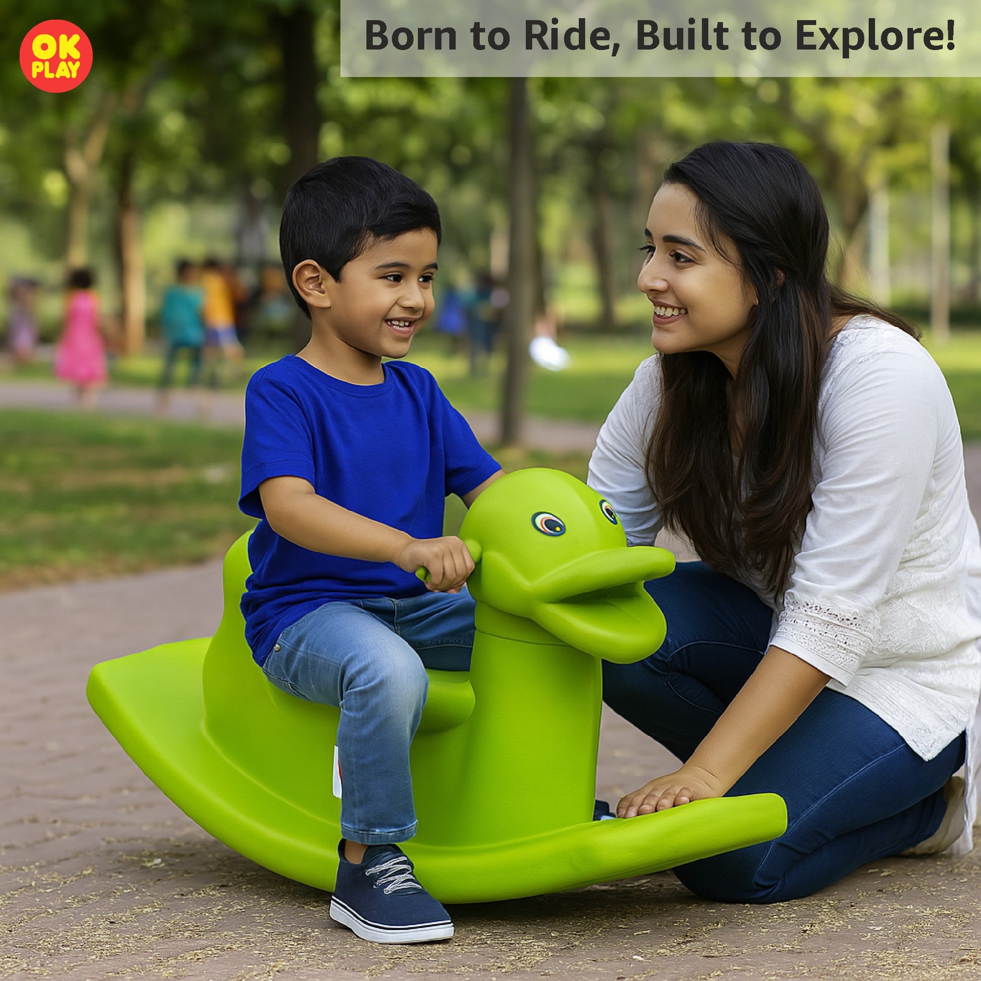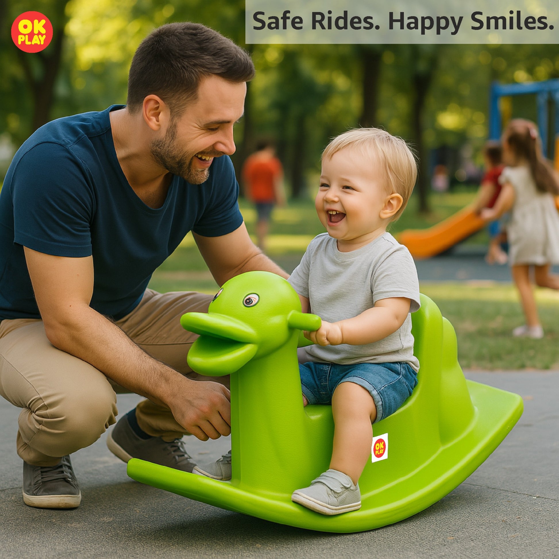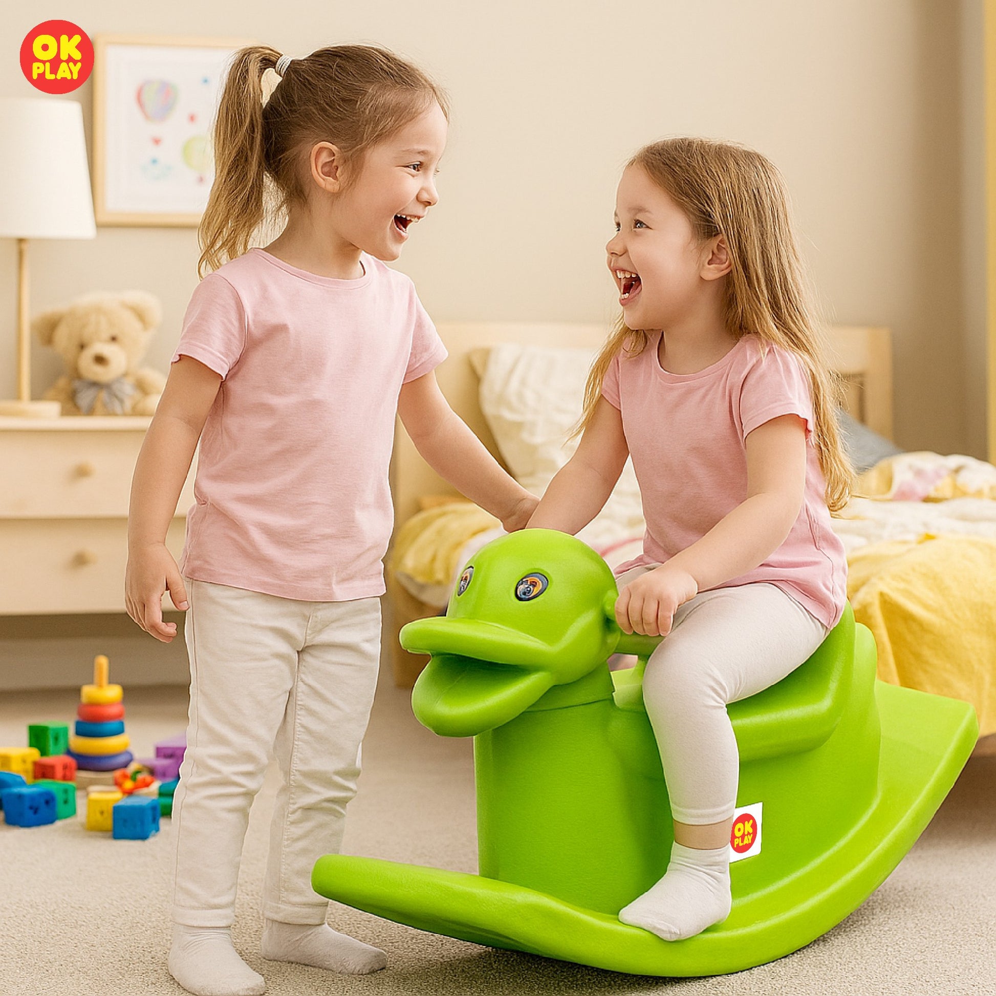 The OK Play Duck Rocker is a fun and engaging ride-on toy designed to bring joy and excitement to young children. Shaped like an adorable duck, this rocker is crafted from high-quality, non-toxic, and durable plastic, ensuring safety, stability, and long-lasting use.With its smooth, rounded edges and ergonomic seat, the Duck Rocker offers a comfortable and secure rocking experience. The easy-to-grip handles provide extra support, allowing kids to balance and develop their motor skills while enjoying endless fun.Its vibrant colors and cute duck design make it visually appealing, sparking imaginative play in children. Lightweight yet sturdy, this rocker is perfect for both indoor and outdoor use, making it an excellent addition to homes, play schools, and daycare centers.Ideal for kids aged 1 year and above, the OK Play Duck Rocker encourages active play, coordination, and confidence, ensuring hours of entertainment and development for little ones.