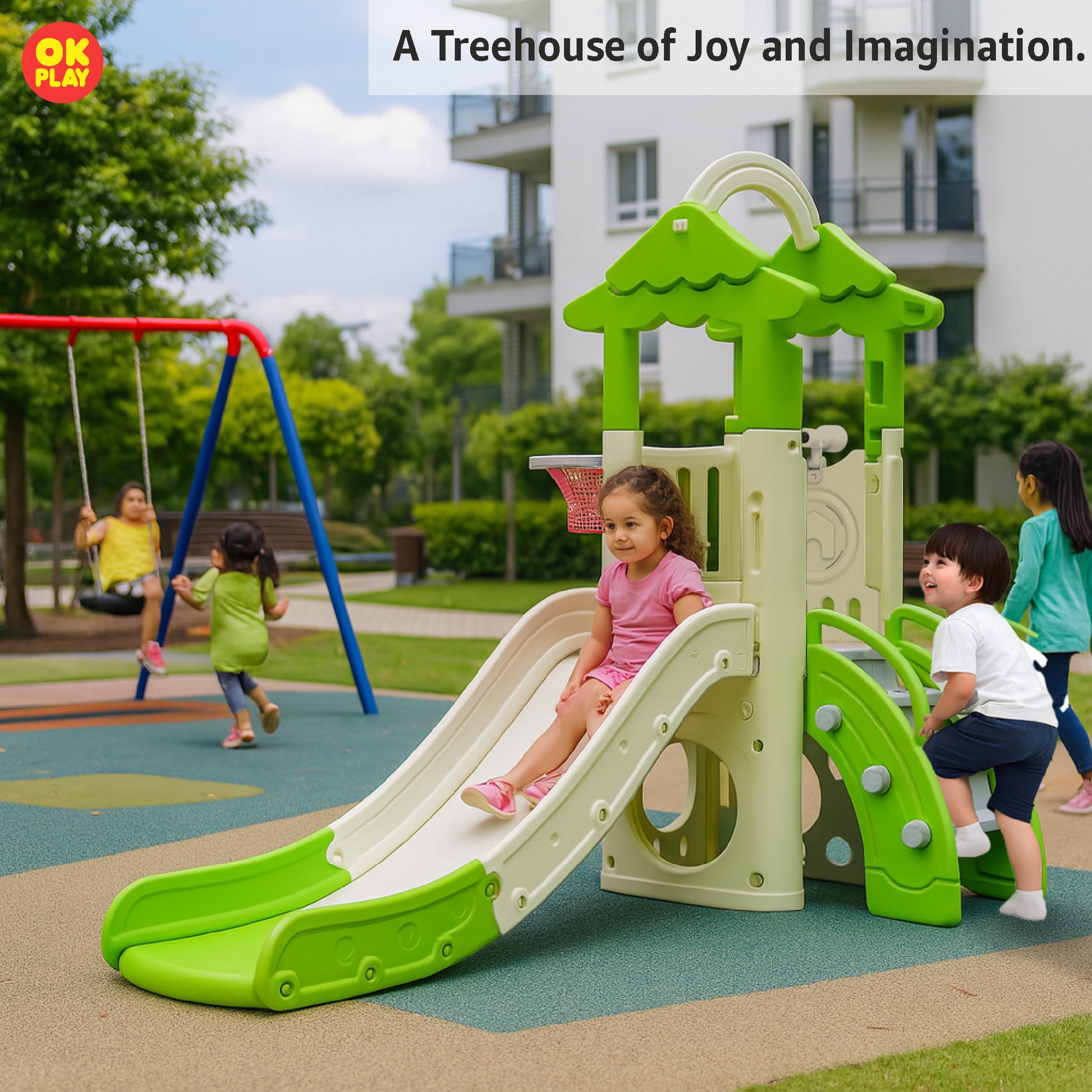 OK PLAY Little Tree House Playground Playset | with Slide & Basketball Hoop for Kids | Perfect for Home School & Playground Safe & Modern Design | Indoor & Outdoor Use | Perfect Gift | Large