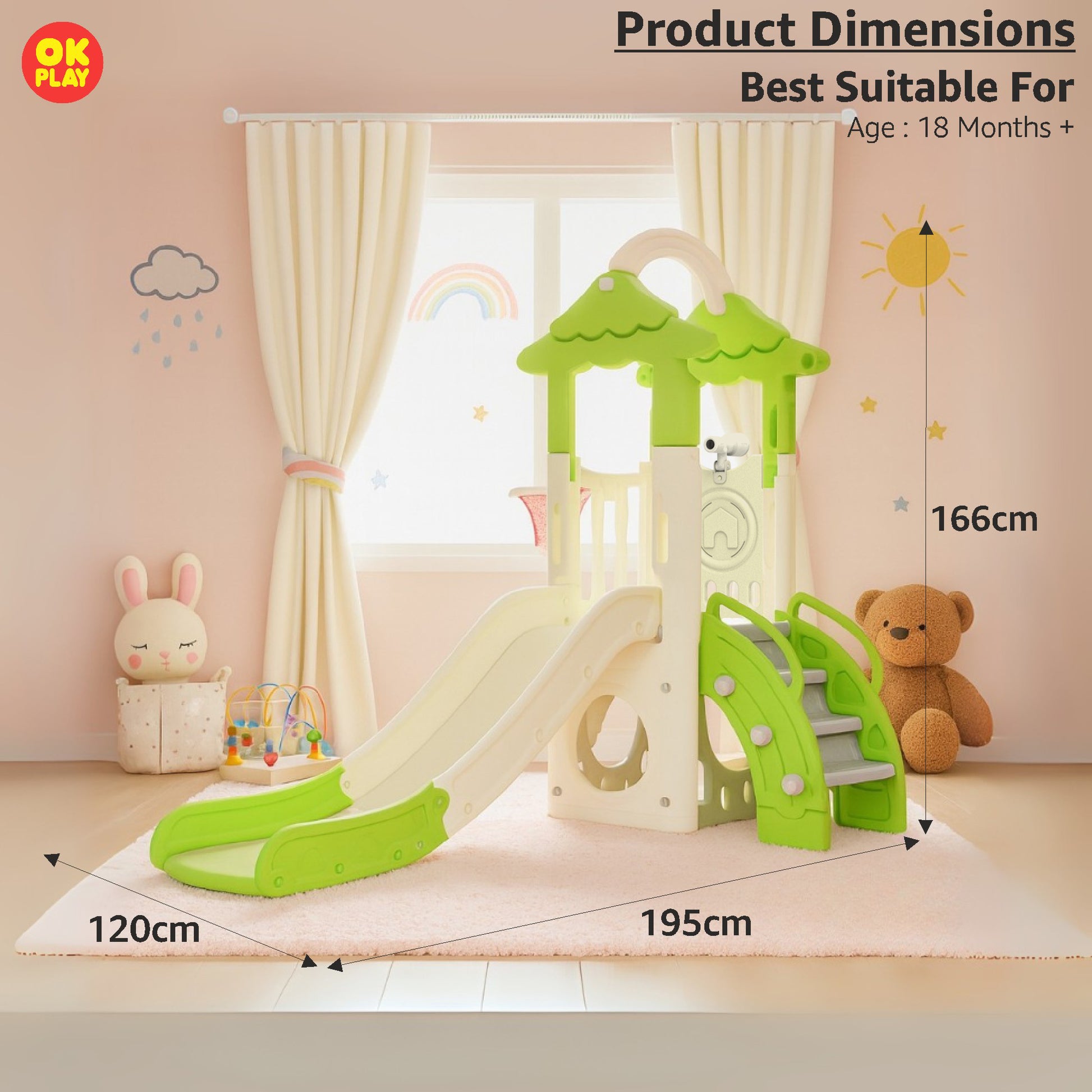 The OK PLAY Tree House is the ultimate adventure playset designed to spark imagination and keep kids engaged in active play. Featuring dual canopy-style towers, a smooth slide, a climbing wall, and a tunnel passage, this multi-activity playset offers endless fun while enhancing physical development. Made from high-quality, child-friendly plastic with smooth edges, it ensures safety and durability for long-lasting enjoyment. Whether indoors or outdoors, its sturdy design withstands all weather conditions, making it perfect for gardens, playrooms, schools, and daycare centers. It is easy to assemble and maintain, with a detailed instruction manual included for hassle-free setup. The OK PLAY Tree House encourages kids to climb, slide, and explore, promoting coordination, balance, and creativity in a fun-filled environment.