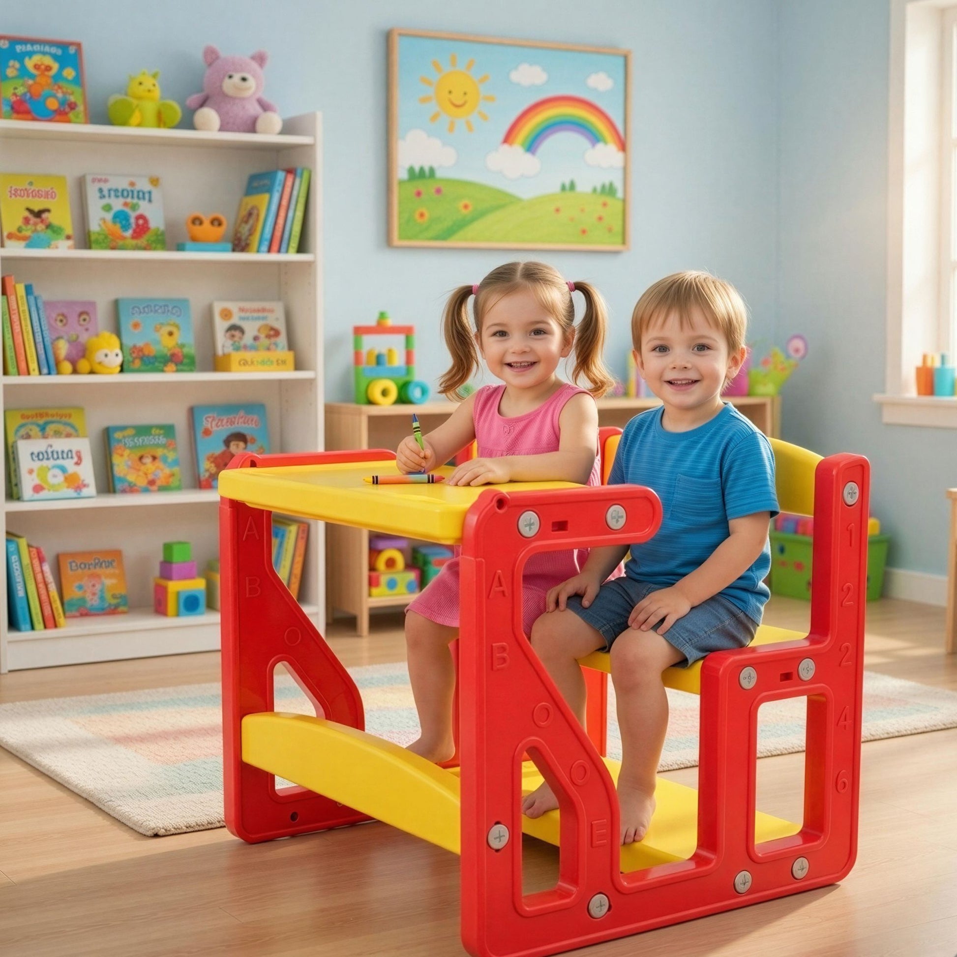 The spacious, streamlined tabletop creates an organised and distraction-free surface, allowing young learners to focus, explore ideas, and express creativity with ease. Presented in tastefully coordinated colour pairings of Yellow–Violet, Red–Yellow, and Green–Yellow, the desk brings a bright yet polished visual appeal to classrooms and home learning areas alike. Designed to encourage independence while complementing modern interiors, Mini Minds Double seamlessly blends stability, functionality, and aesthetic finesse—making it a sophisticated choice for contemporary learning spaces.