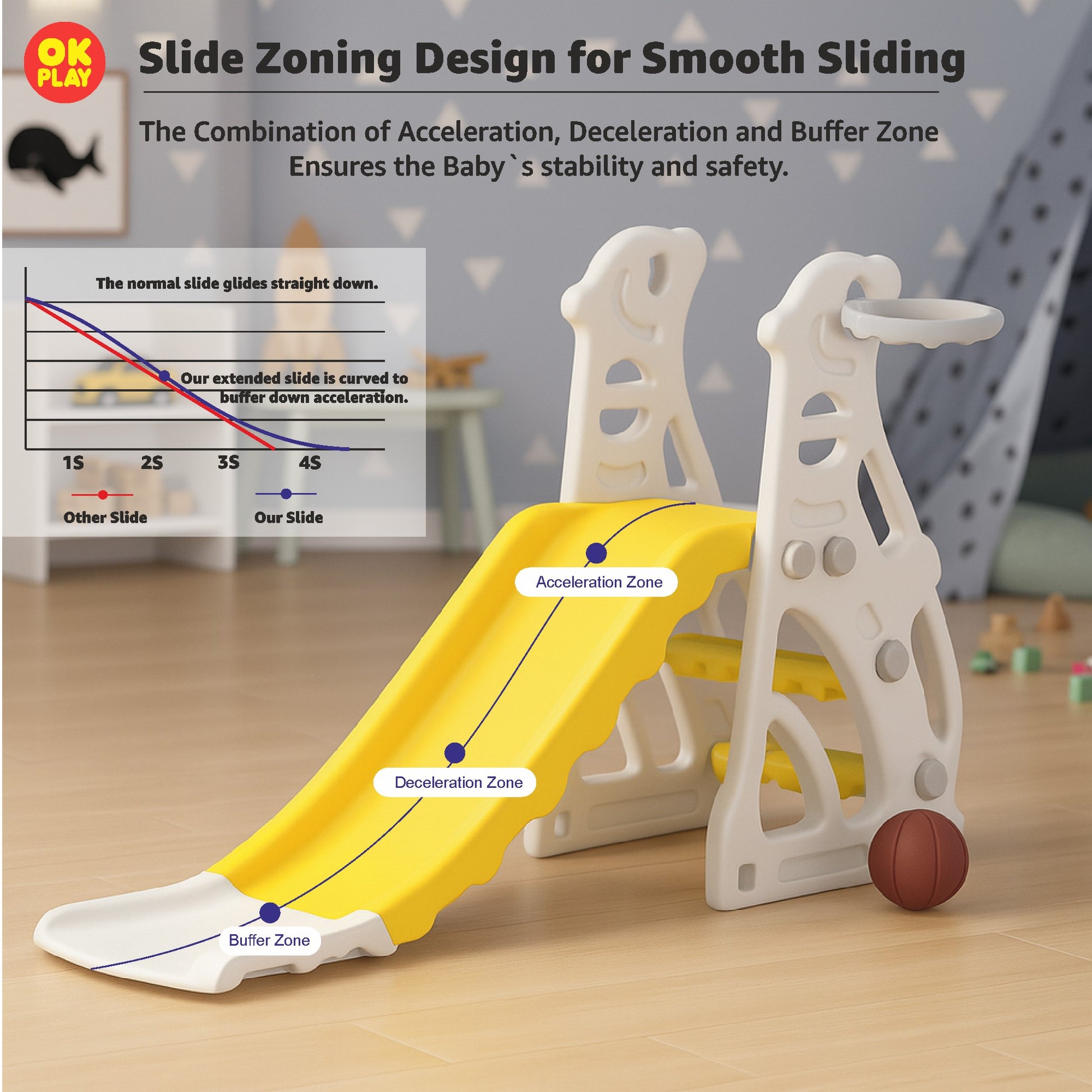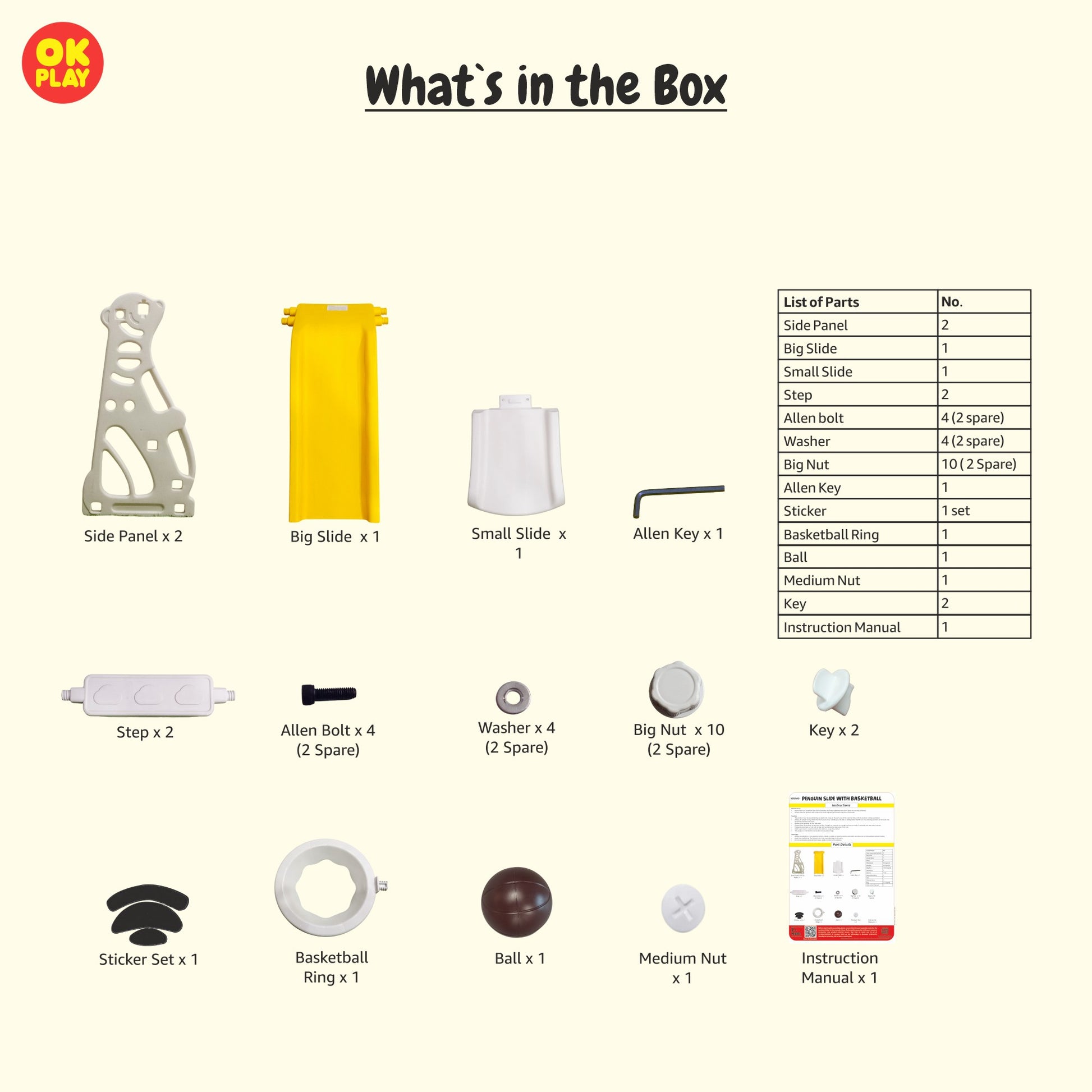 The OK PLAY Penguin Slide with Basketball Ring is designed for endless fun while ensuring complete safety and convenience. With a spacious sliding surface, kids can enjoy a smooth and exciting ride, while the anti-skid steps and easy-grip handles provide a secure and comfortable climb. Made from durable, weather-resistant, and non-toxic plastic, this playset is perfect for both indoor and outdoor use. The attached basketball ring with a ball adds extra excitement, promoting active play and motor skill development. Plus, it’s easy to assemble—all necessary parts are included in the box along with a detailed instruction manual, making setup hassle-free. Bring home this 2-in-1 playset and let your little one slide, shoot, and play with confidence.