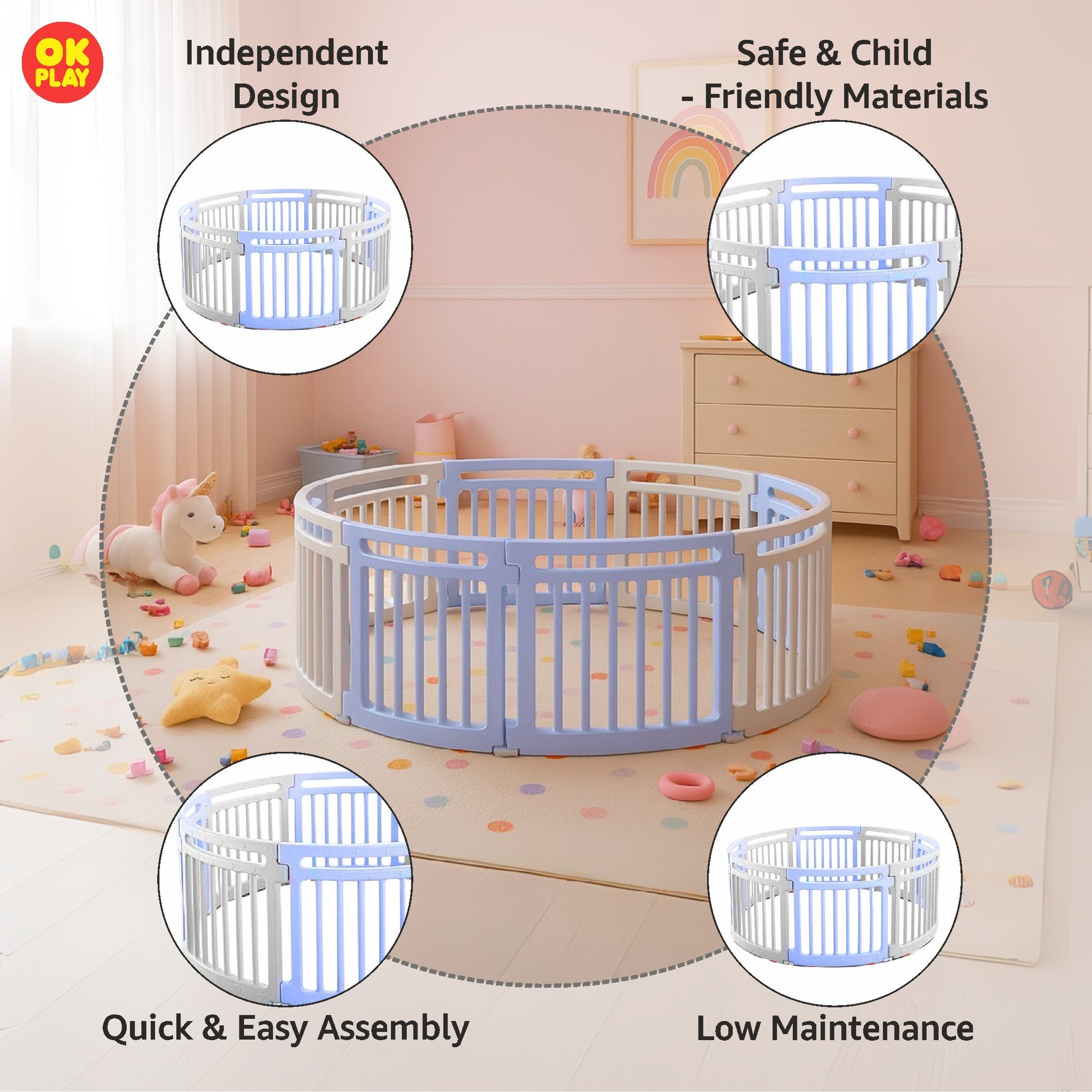 OK PLAY 8 Panel Round Playpen For Kids | Play Yard | Baby Fence | Perfect for Home, School & Playground | Easy Assemble | Anti Slip | Indoor Outdoor Games | Safe toy | Perfect Gift