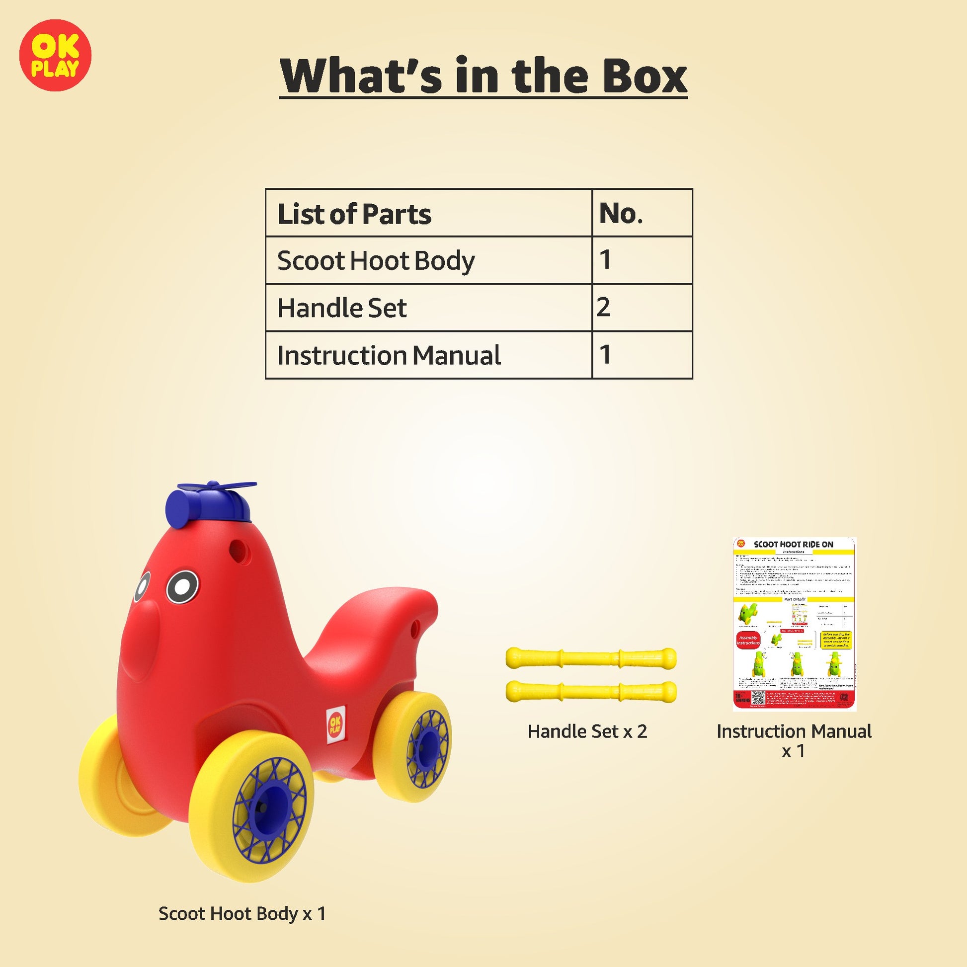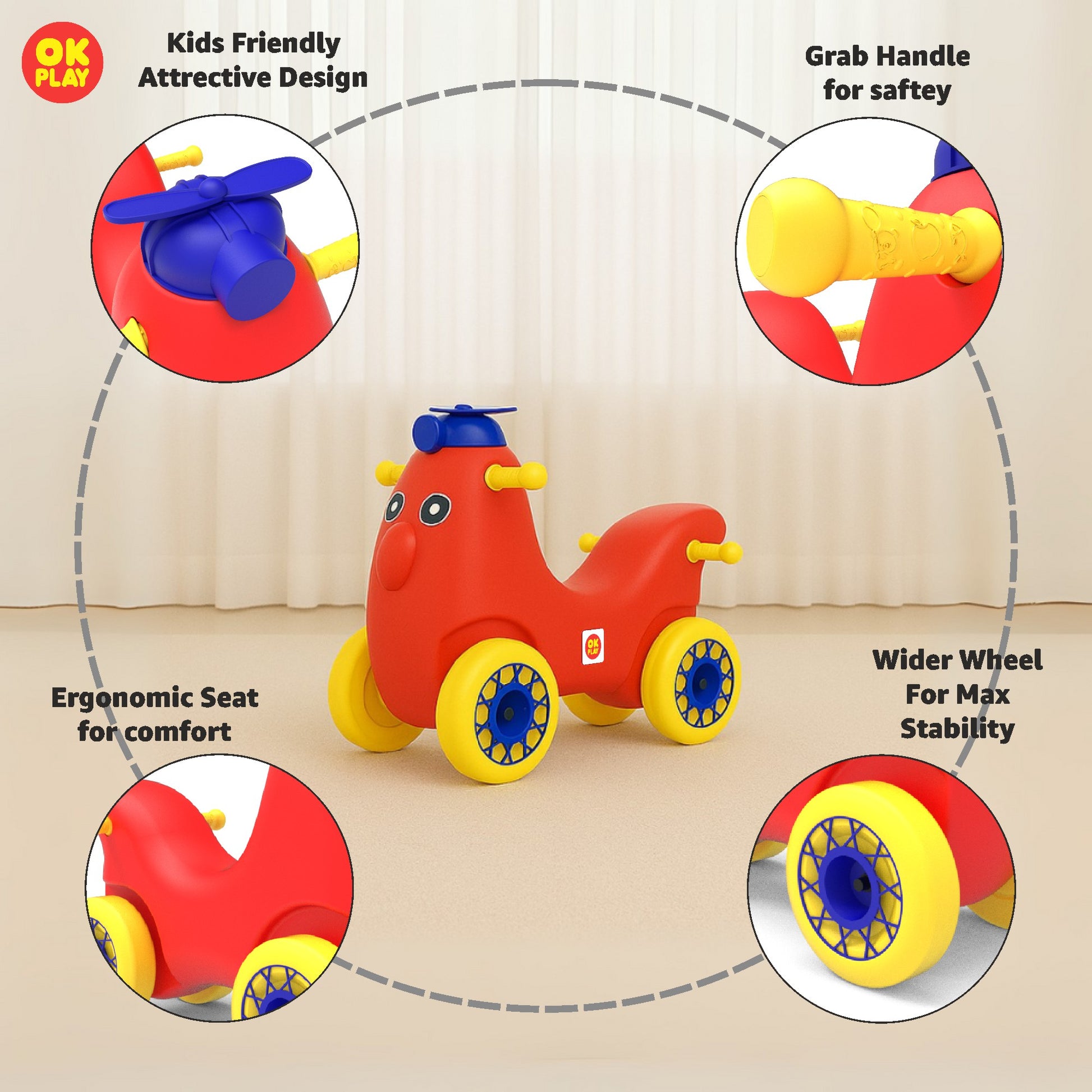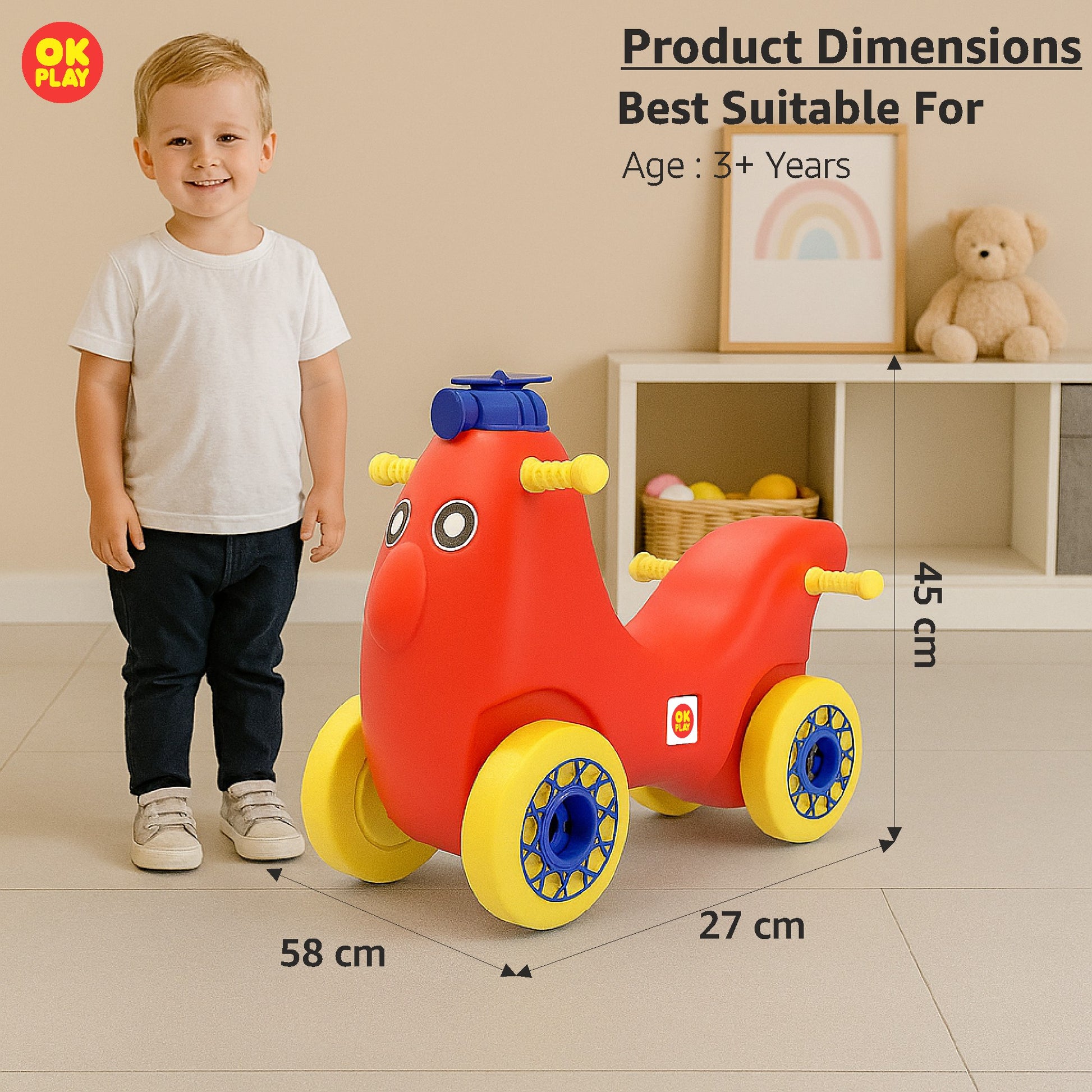 The OK Play Scoot Hoot is a stylish and sturdy ride-on toy designed for endless fun and active play. With its vibrant color combination and ergonomic design, this ride-on is perfect for toddlers to develop their motor skills, coordination, and balance while having an exciting adventure.Made from high-quality, non-toxic, and durable plastic, the Scoot Hoot is lightweight yet strong enough to support a child’s weight comfortably. It features a comfortable seat, easy-grip handles, and smooth-rolling wheels, ensuring a safe and effortless ride. The backrest support enhances comfort, while the wide wheelbase adds stability to prevent tipping.Designed for indoor and outdoor play, this ride-on encourages active movement, allowing kids to scoot around freely and build their confidence. Ideal for children aged 1.5 years and above, the OK Play Scoot Hoot is a fun and engaging toy that helps in the early development of balance and coordination skills while keeping kids entertained for hours.
