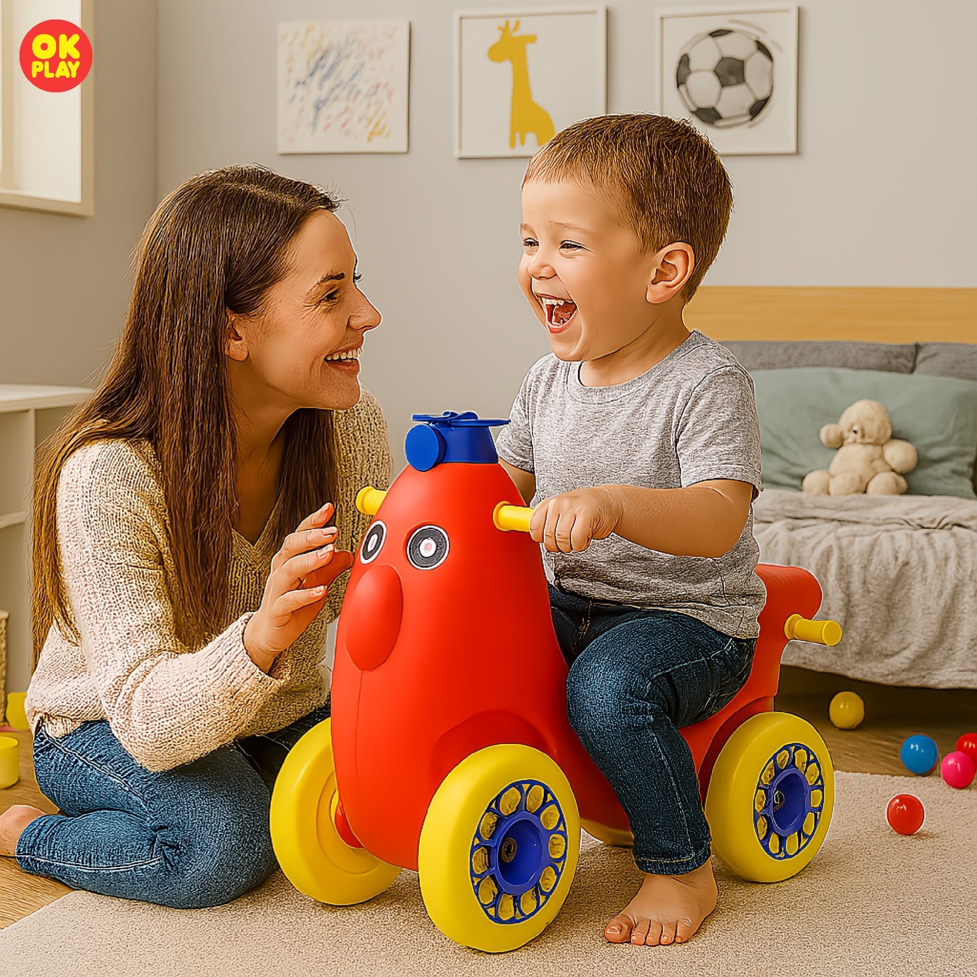 To ensure the longevity and safety of your OK PLAY toy, clean it regularly with a damp cloth and mild soap to remove dust and stains. Avoid using harsh chemicals or abrasive materials that may damage the surface. Store the toy in a dry place away from direct sunlight and extreme weather conditions to maintain its color and durability. Periodically check for loose parts or wear and tear, and tighten or replace components if necessary.