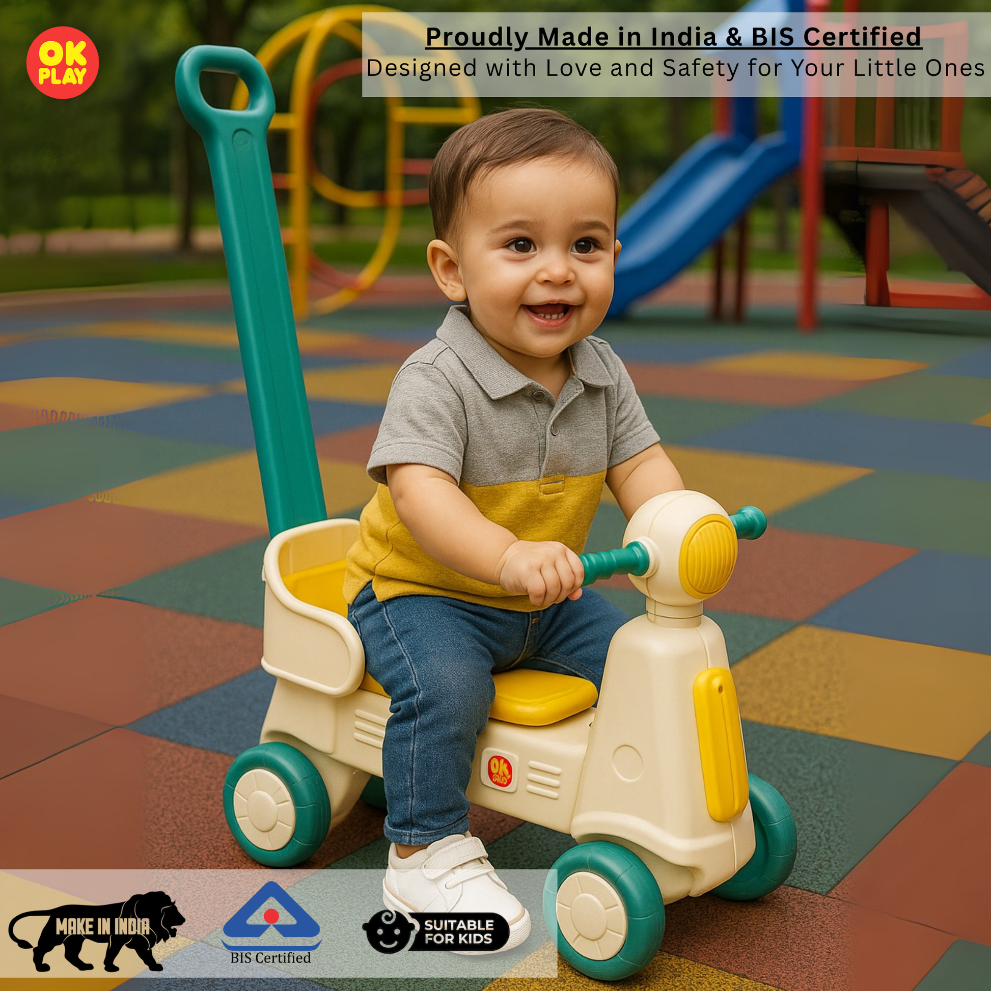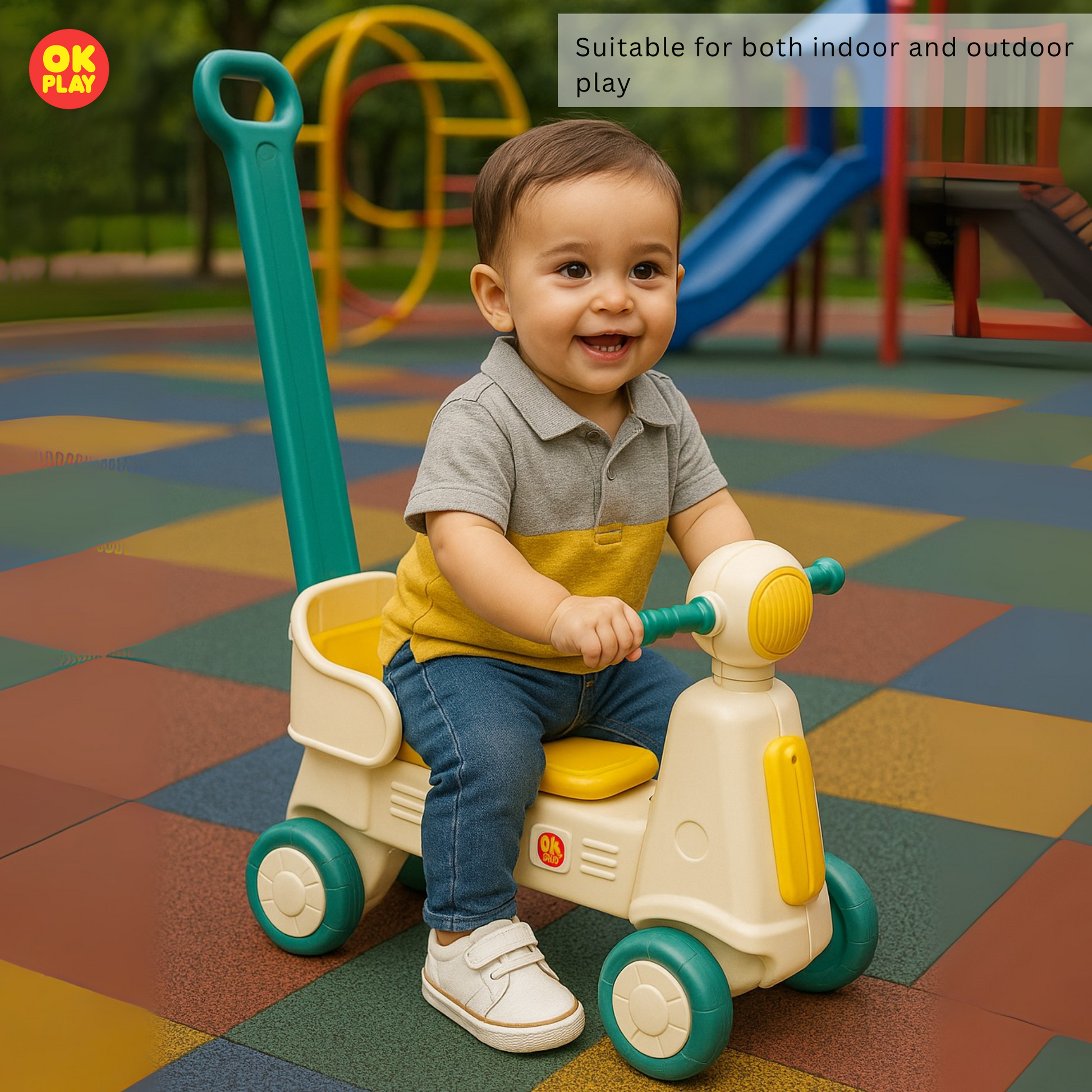 OK PLAY Scooter Ride On Push On for Kids | Backrest | Easy Grip | Anti Skid | Four Wheel Ride | Indoor & Outdoor Ride On | Light-Weight | Durable | Portable | Perfect Gift