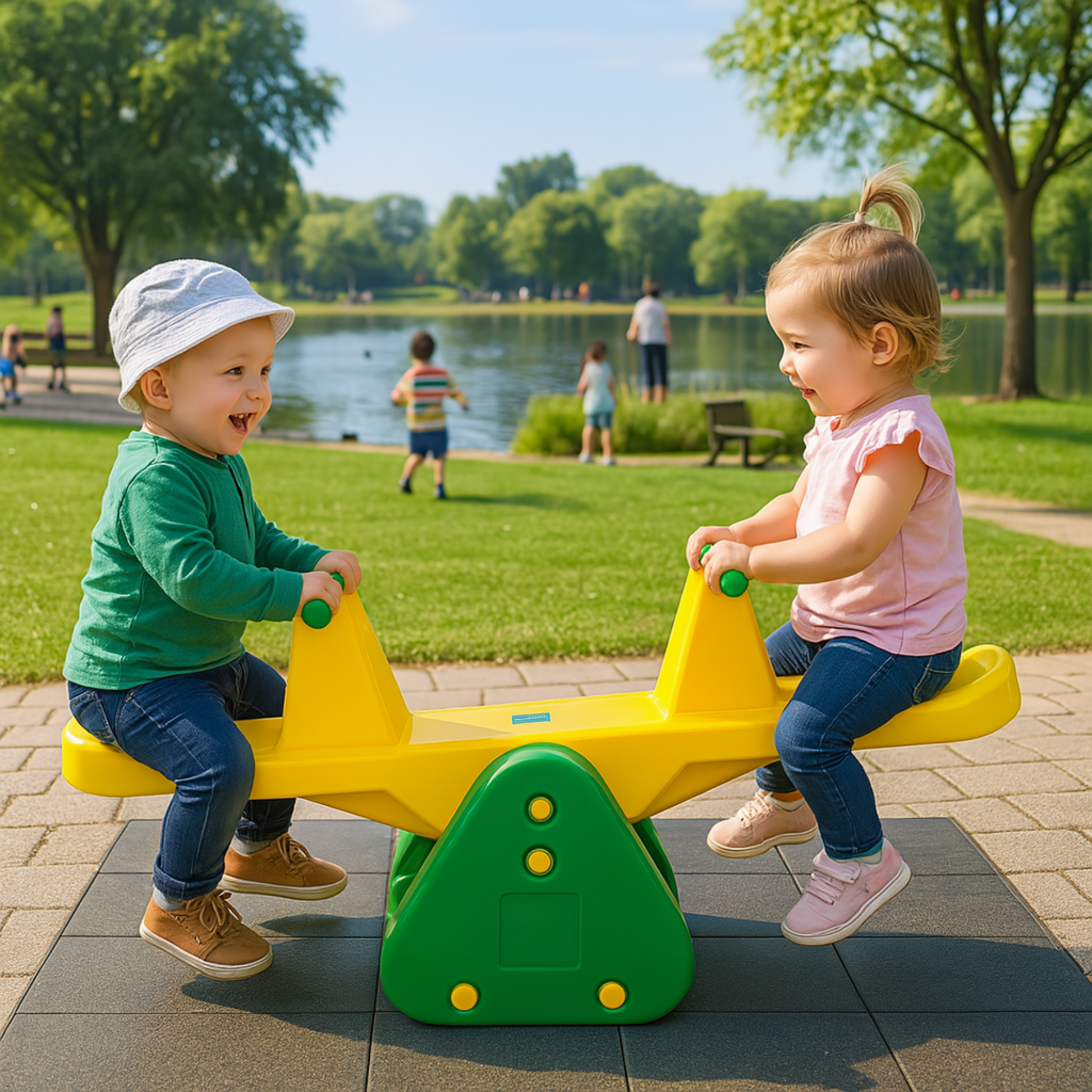 The OK Play Green and Yellow See Saw is a delightful and engaging play equipment designed to provide hours of fun while enhancing physical development in young children. Suitable for kids aged 2 years and above, this see saw is crafted from high-quality, non-toxic, and durable plastic, ensuring safety, sturdiness, and longevity. The vibrant green and yellow color combination adds an exciting and playful touch, making it an attractive addition to any indoor or outdoor play area.Engineered with child-friendly features, this see saw has smooth, rounded edges to prevent injuries, easy-grip handles for a secure hold, and molded, comfortable seats that provide ergonomic support. The anti-skid base ensures stability and balance, reducing the risk of tipping over during play. Its lightweight yet robust structure makes it easy to move, allowing parents to set it up effortlessly in a backyard, garden, playroom, or school playground.Beyond entertainment, the rocking motion of the see saw promotes muscle development, improves balance, and enhances coordination, making it a great way for children to engage in active play while strengthening their motor skills. Weather-resistant and easy to maintain, the OK Play Green and Yellow See Saw is an excellent investment for encouraging social interaction, teamwork, and physical exercise, ensuring that kids stay active, happy, and engaged.