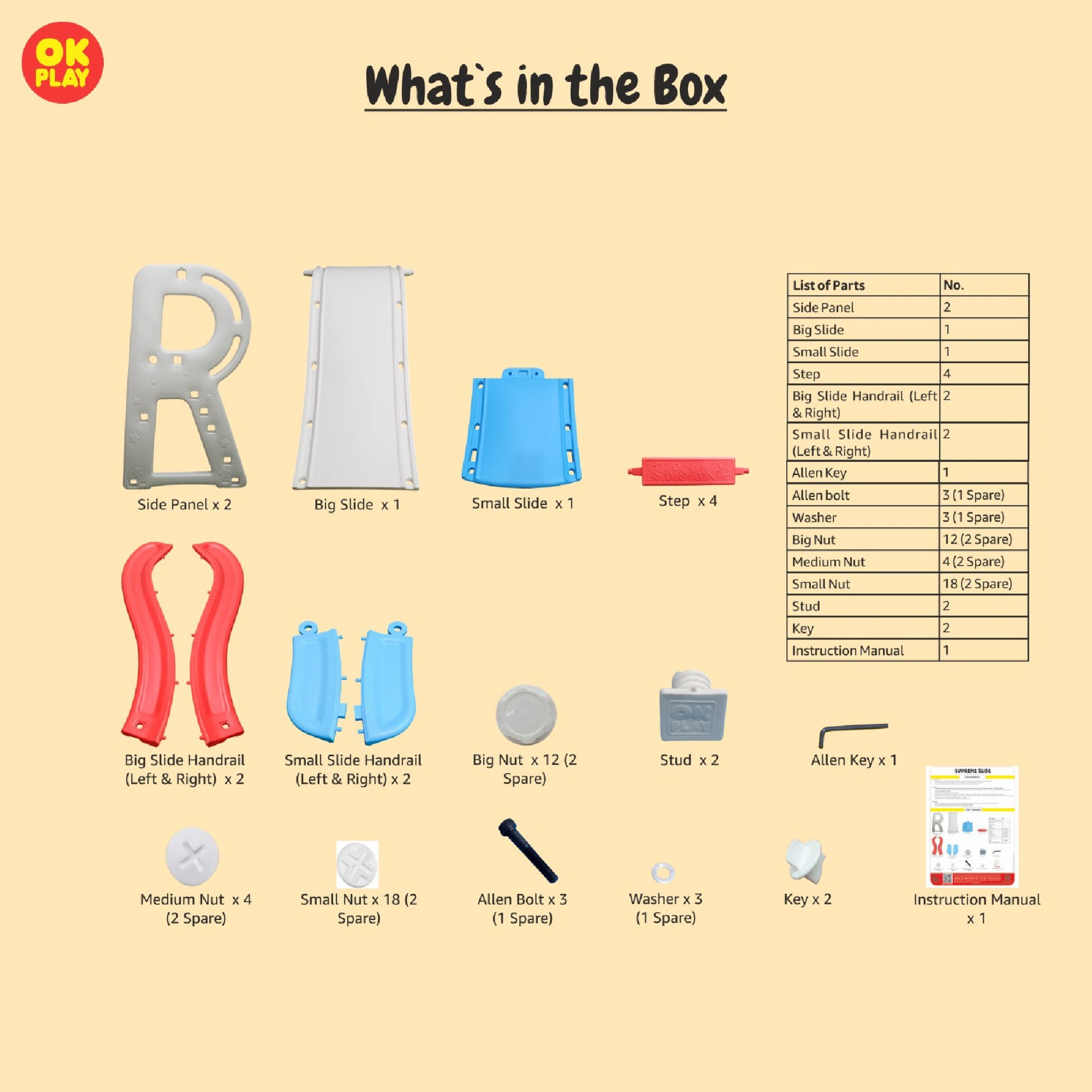The OK PLAY Slide Supreme is a perfect addition to any play area, offering endless fun for children aged 2 years and above. Designed for both indoor and outdoor use, this slide is ideal for homes, gardens, schools, and playgrounds. Made from durable, weather-resistant, and non-toxic plastic, it ensures long-lasting safety and enjoyment. The anti-skid steps and smooth edges provide a secure climbing and sliding experience, while the lightweight design allows for easy portability. Quick and hassle-free to assemble, this slide is a great way to encourage active play, balance, and motor skill development. With its vibrant colour combination, it adds a fun and cheerful touch to any space.