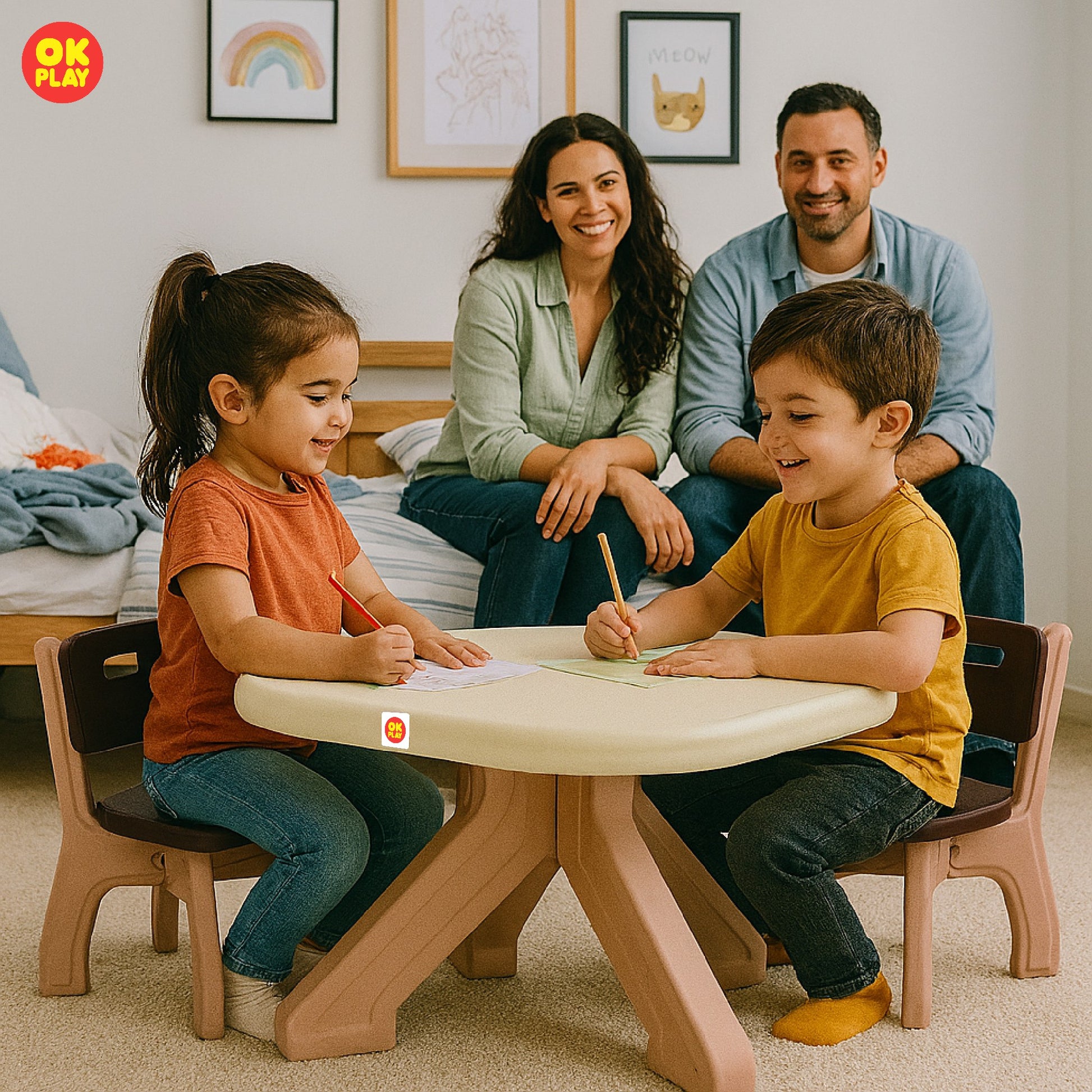 Give your little one a comfortable, safe, and engaging space to explore, learn, and play with the OK PLAY Table & Chair Set. Designed for kids aged 2 years and above, this set is ideal for studying, drawing, reading, and fun activities at home, school, or daycare.Made from premium-quality, durable, and non-toxic plastic, this set is designed with child-friendly, rounded edges for maximum safety. The ergonomically designed chairs provide proper back support, ensuring comfortable seating for long hours of use. The sturdy and spacious table offers plenty of room for multiple activities, fostering creativity and learning.Lightweight yet strong and stable, this set is easy to assemble, move, and store, making it ideal for both indoor and outdoor use. Its smooth surface makes cleaning effortless, ensuring a hygienic space for your child. Whether for study time, snack breaks, or playdates, the OK PLAY Table & Chair Set is a must-have addition to your child’s space, combining style, safety, and functionality.Let your child explore, learn, and grow with a versatile, durable, and thoughtfully designed table and chair set!