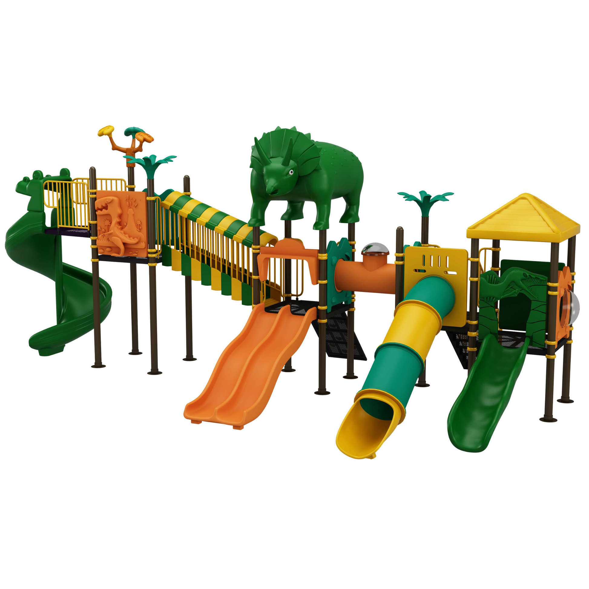 The Dinosaur Series is available across multiple thoughtfully designed variants, including Rox, Archie, Cirano, Raptar, Theco, Todd, Brute, Critter, Beast, Barney, Bonehead, Slego, Tricero, Arlo, and Craig. Each variant offers a distinct configuration with carefully selected play elements such as slides, climbers, bridges, platforms, and interactive panels. Some models focus on a single core activity, while others combine multiple play features, allowing flexibility to suit different space layouts, age groups, and play intensity requirements within modern playground equipment installations.
